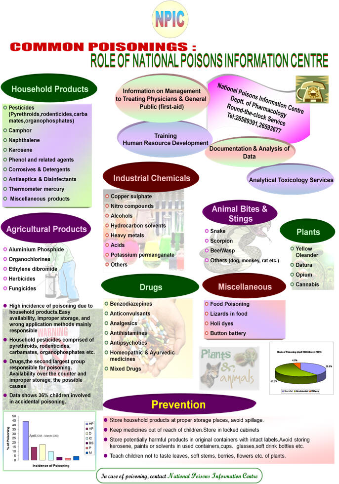 A wide variety of chemicals are designed for diverse uses in day today life. Though their benefits are enormous, yet they are associated with great risks if misused. The probability of ingestion of these substances/products either accidentally or intentionally has increased manifold. Acute poisoning is one of the commonest emergencies throughout the world. To ensure chemical safety, a framework for prevention and management of eventualities if any, is provided by the Poisons Control Programme of which Poisons Information Centre is an integral part. |